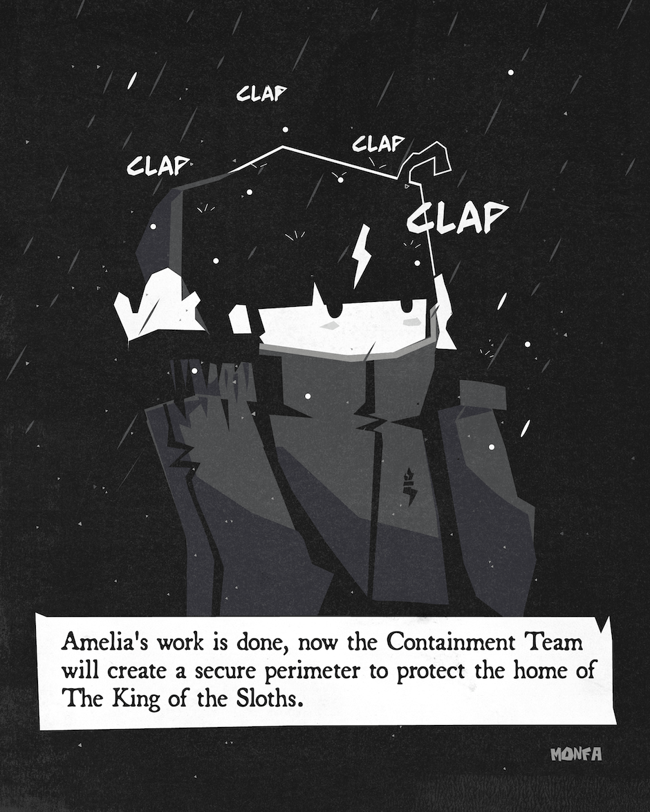 The rainforest adventure is coming to an end. It’s time to go. Amelia has served her purpose as part of the Anomalous Affairs Control and Containment Unit. Let’s hope it takes another 100 years or more before the Sloth King is seen again.